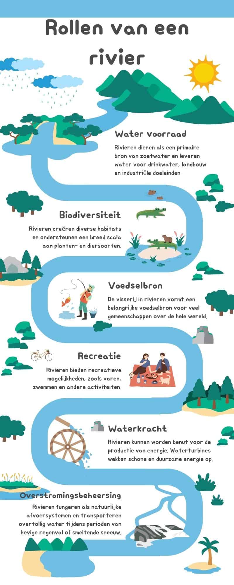 Hiernaast kan je zo een voorbeeld vinden, in dit geval van de rol van een rivier. De afbeeldingen en de tekst samen vormen op deze infografic (gemaakt met Canva btw šŸ¤“)