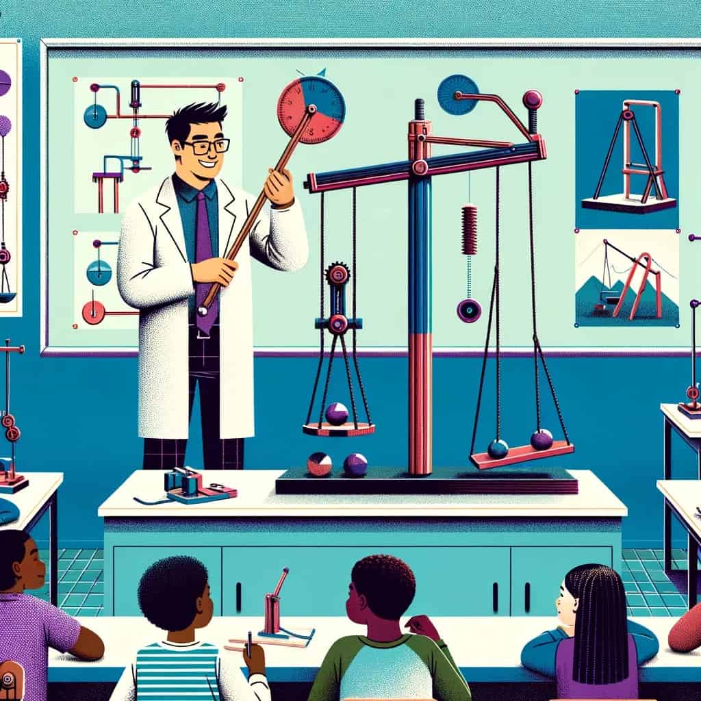 In een les fysica over de evolutie van machines stelt de leraar als doel om de concepten van hefbomen en katrollen te begrijpen.